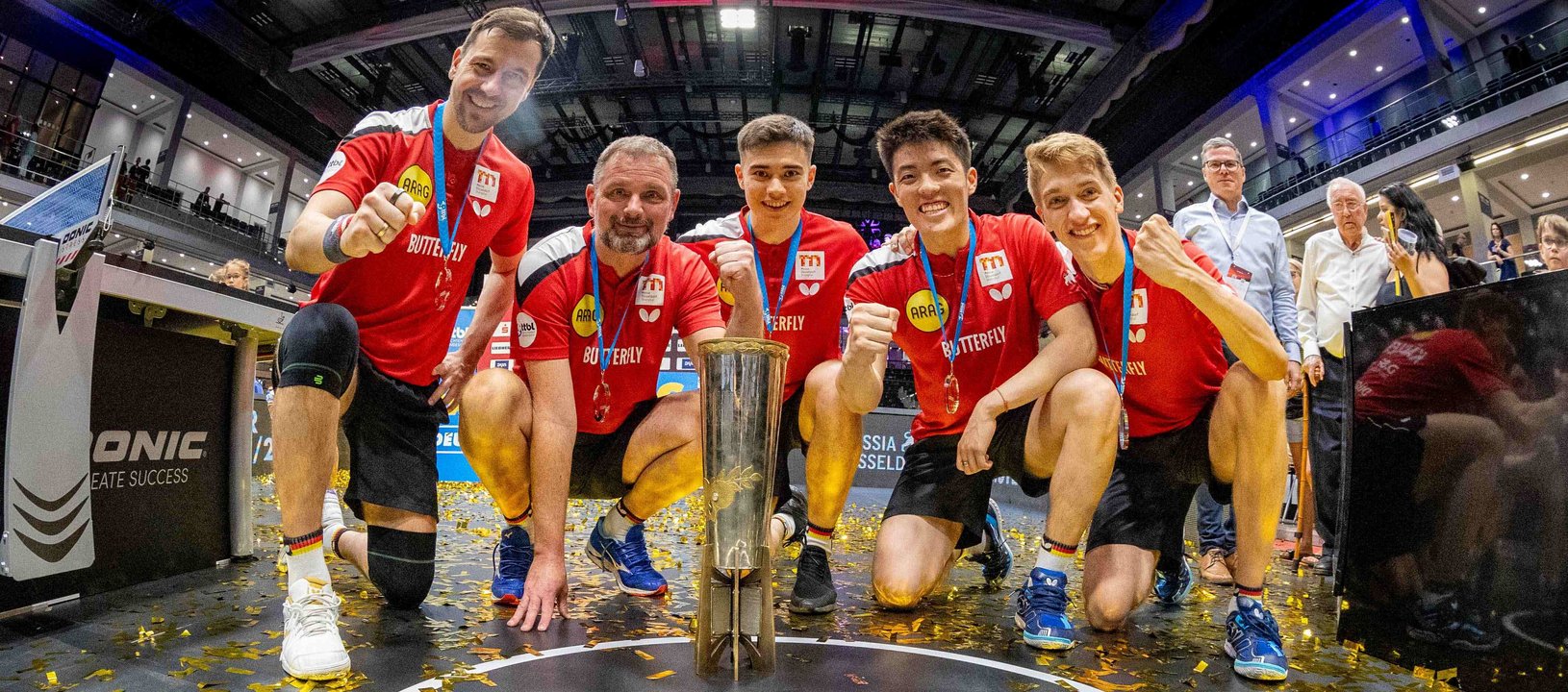 Nach Källbergs Auftaktsieg legte Dang Qiu mit dem 3:1 (11:8, 11:1, 10:12, 11:1) gegen Darko Jorgic nach, und die Düsseldorfer Fans durften auf den perfekten Nachmittag hoffen. Denn im dritten Match feierte Timo Boll sein Comeback nach fast fünfmonatiger Zwangspause aufgrund einer Schulterverletzung, mit dem entscheidenden Sieg zum Titel klappte es allerdings nicht. Gegen Takuya Jin unterlag die deutsche Tischtennis-Legende mit 1:3 (6:11, 11:8, 9:11, 9:11). „Es ist ein Mannschaftssport, und am Ende haben wir gewonnen“, resümierte Boll nach seiner 13. Deutschen Mannschaftsmeisterschaft. „Ich bin sehr stolz auf das Team. Anton und Dang haben eine super Leistung gezeigt. Insgesamt bin ich zufrieden mit unserer Teamleistung und auch mit meinem Körper, dass er die Belastung geschafft hat.“